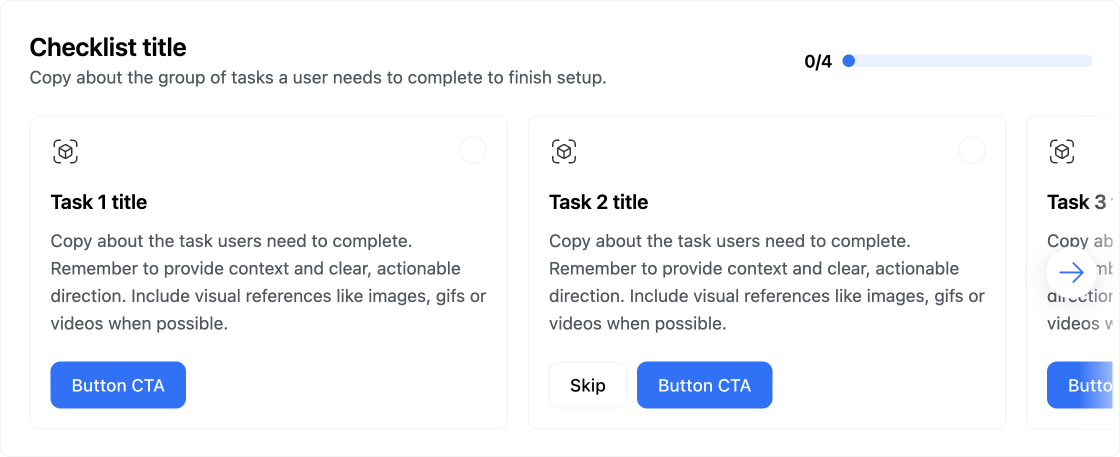 - Avoid Basic “Mark Done” Steps: Whenever possible, tie checklist steps to actual workflows and tasks. Deep linking users to complete actions is way more effective. It’s okay to have “Skip” or “Mark done” as secondary options for non-essential steps.