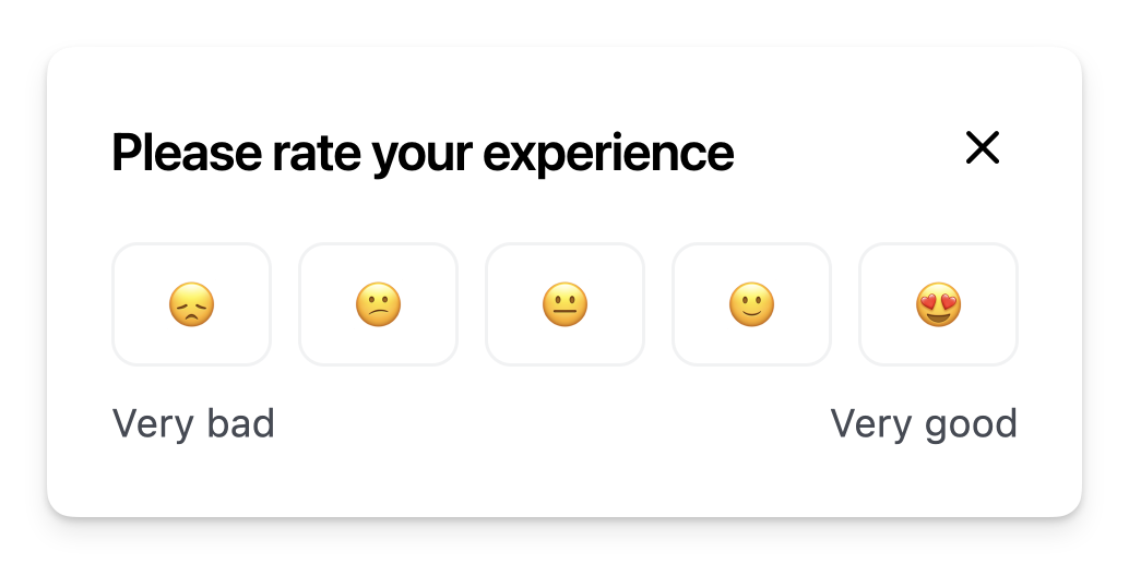 The component comes with a default NPS scale of 0-10. You can also use a custom scale by passing theoptions property either directly in the React component or in the YAML config via the props property. For instance, in the example below, we’re using an emoji scale: