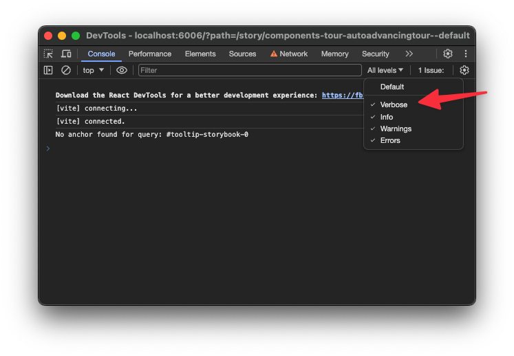 If a Step in a Tour is not appearing when you expect it to, you can enable debugging by enabling Verbose logging in your browser. To enable this in Chrome Devtools, simply click the three dot menu in the console as shown below:
