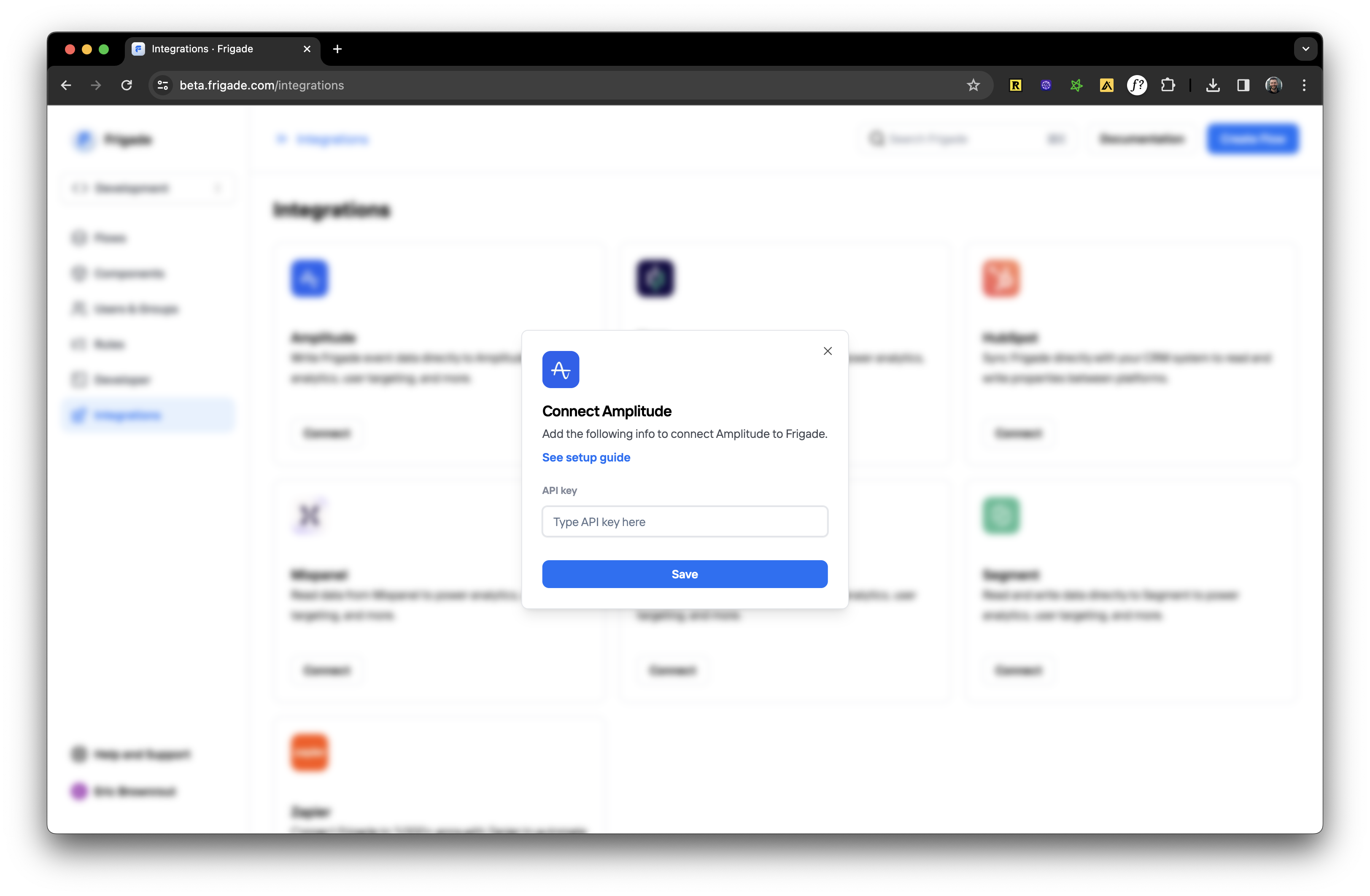 Open the Integrations page in Frigade and select Amplitude. Paste the API key you copied in step 1 and click Save. If the integration is enabled, events will start streaming to Amplitude immediately.