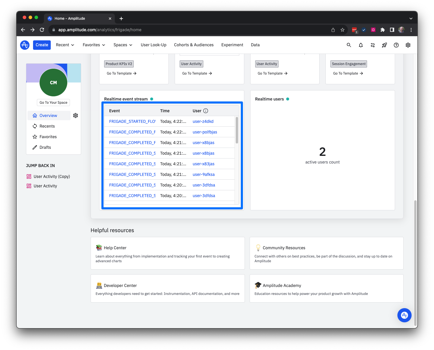 Open the dashboard for the project you selected in step 1 and take some action in any given Frigade Flow such as completing a step. You should see events starting to stream from Frigade in the Realtime event stream widget: