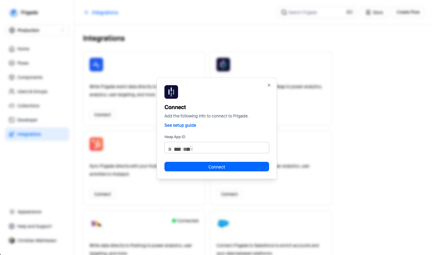 Next, go to your Frigade dashboard and select Integrations. Click Add Integration and select Heap.