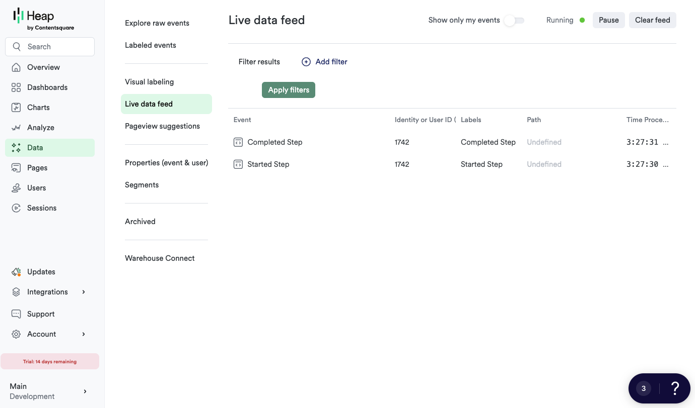 You should now see events from Frigade in your Heap dashboard. You can test the integration by completing a Flow and checking the Live data feed page in Heap: