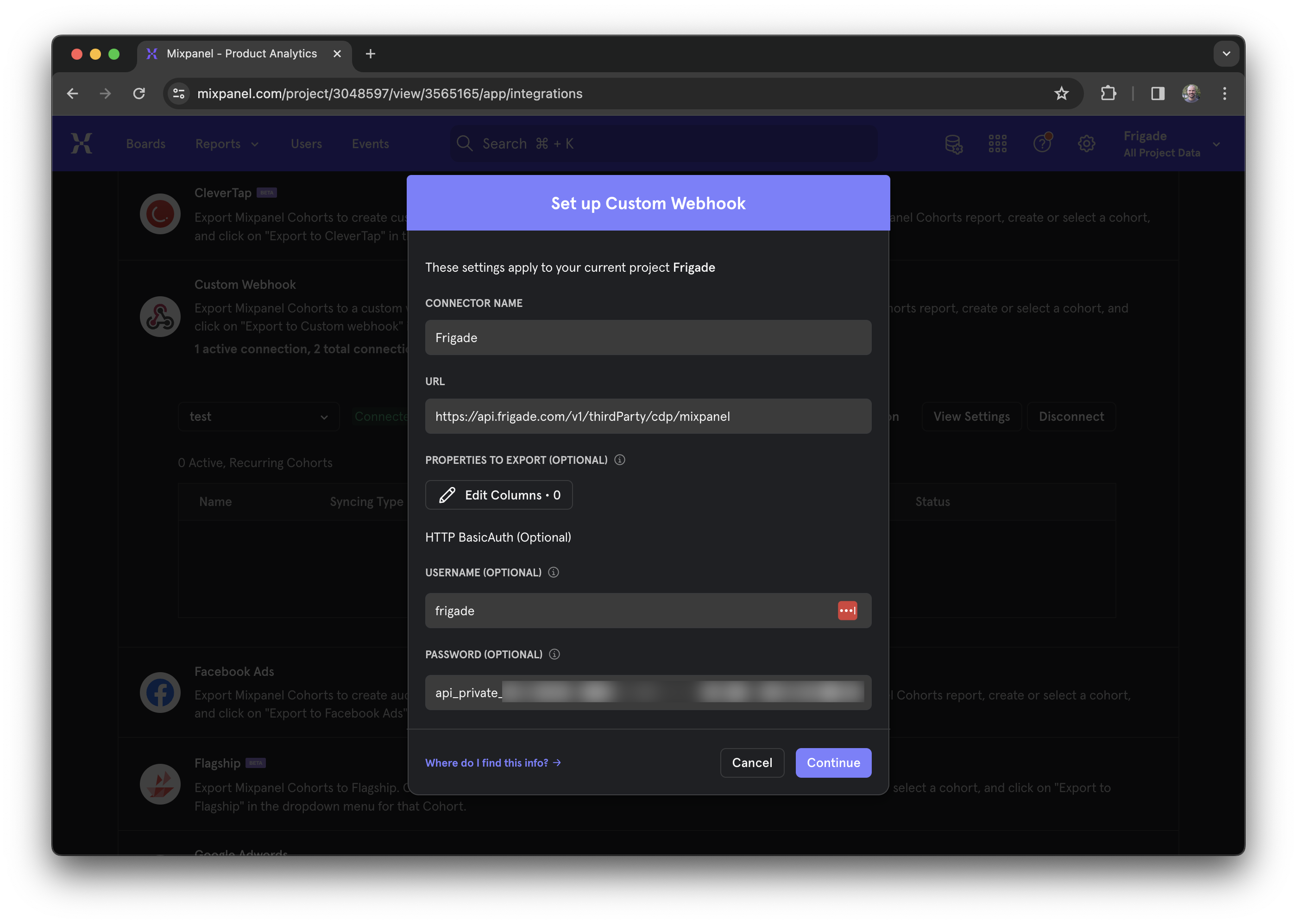 https://api.frigade.com/v1/thirdParty/cdp/mixpanel - Username: