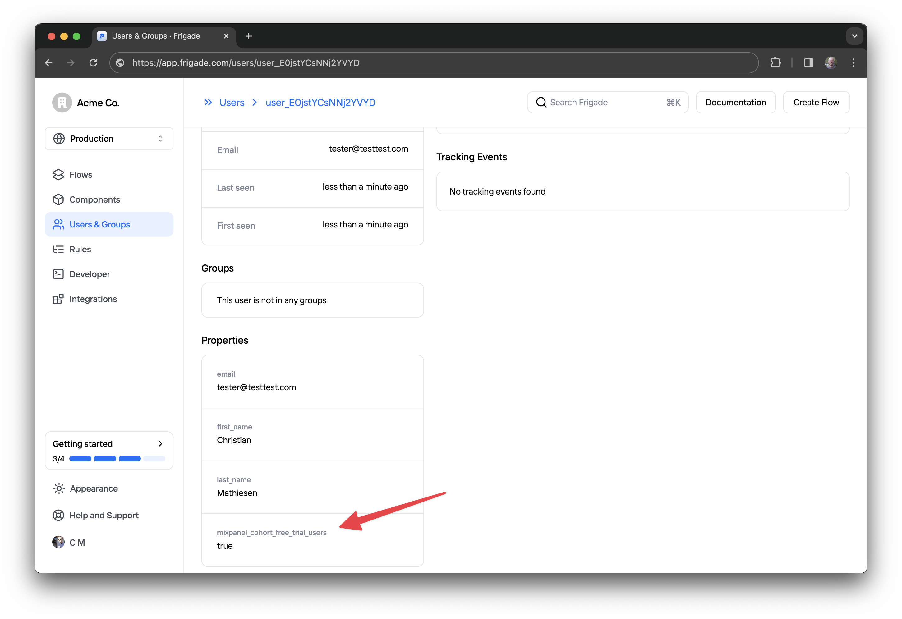Your Mixpanel cohorts appear as properties on your users in Frigade. Each cohort is prefixed with
