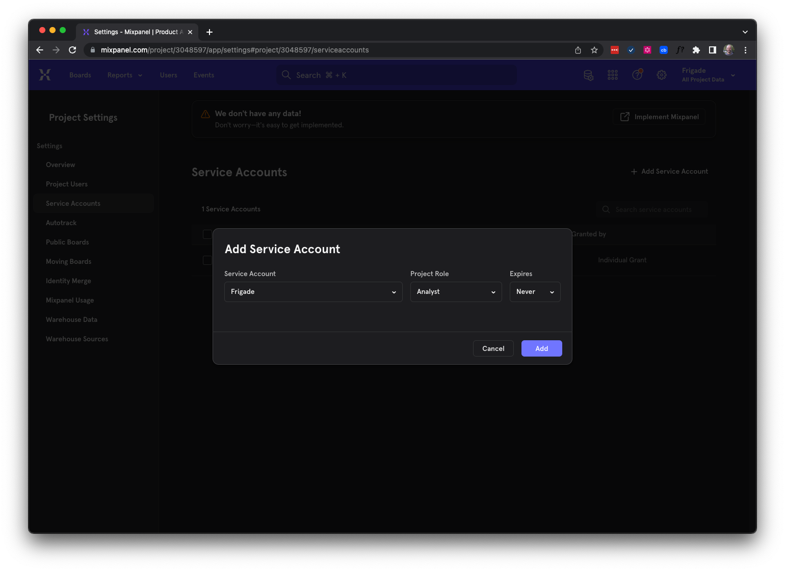 To create a service account for Frigade, open your Mixpanel project, then click Project Settings and select the Service Accounts tab. Then click Add Service Account and select Analyst as the role.