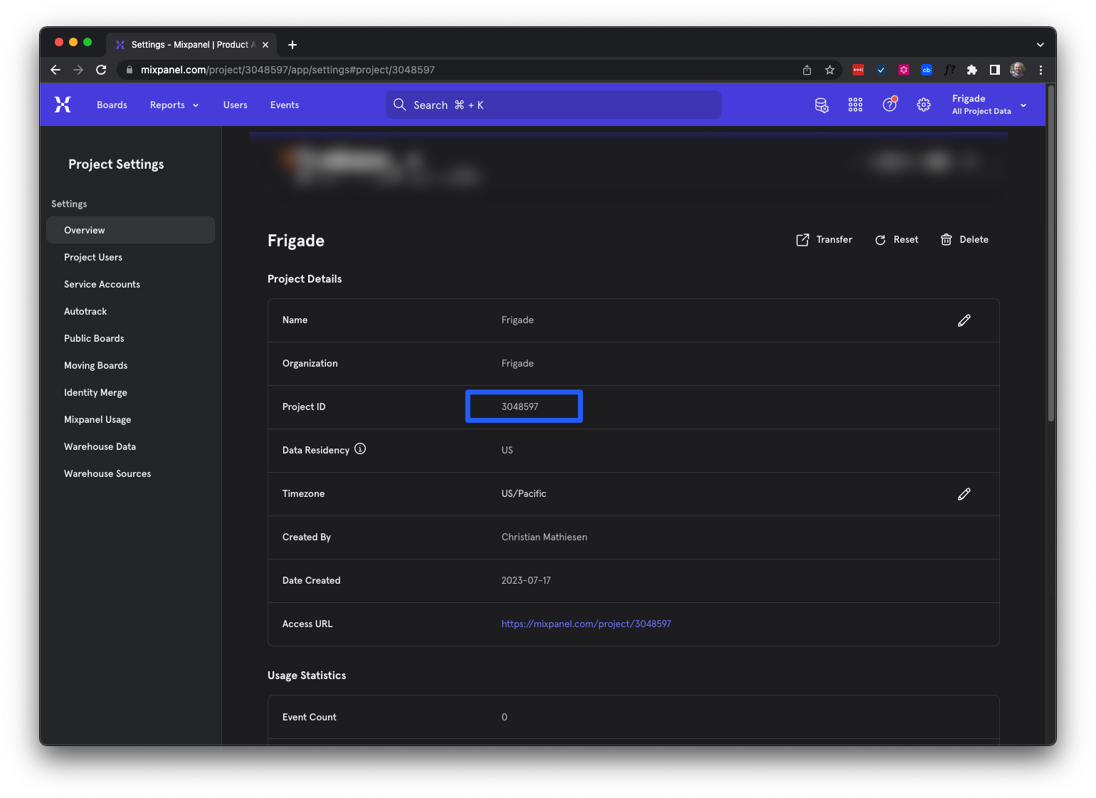 Open the Integrations page in the Frigade dashboard and click the “Connect” button for Mixpanel. Then paste the two keys you copied in the previous step into the corresponding fields.Then, copy the Project ID from Mixpanel that you wish to sync cohorts from. You can find the Project ID on the Project Settings page in Mixpanel: