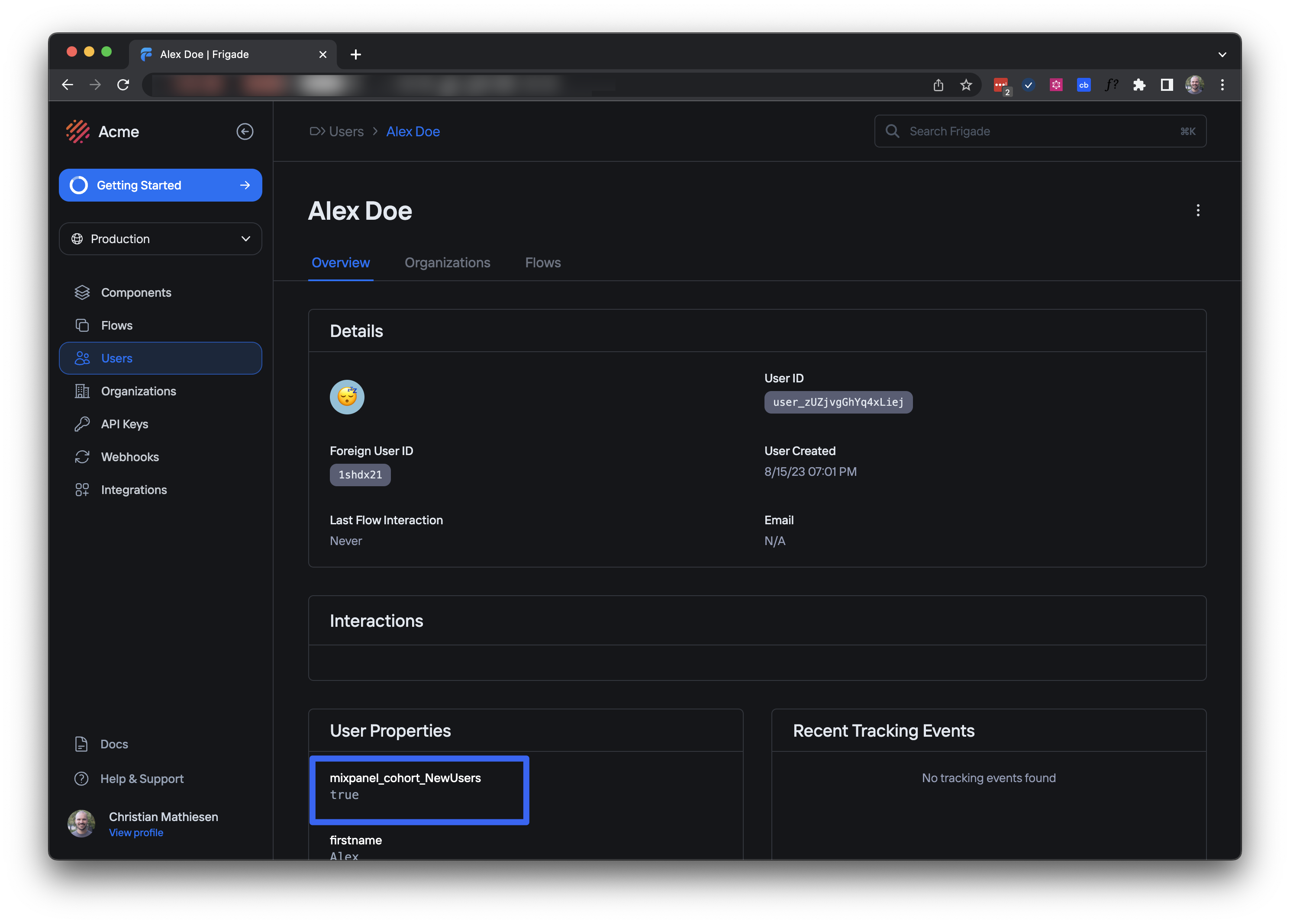 mixpanel_cohort_ and the name of the cohort. For example, if you have a cohort named NewUsers, you will see a property named mixpanel_cohort_NewUsers on your users in Frigade.