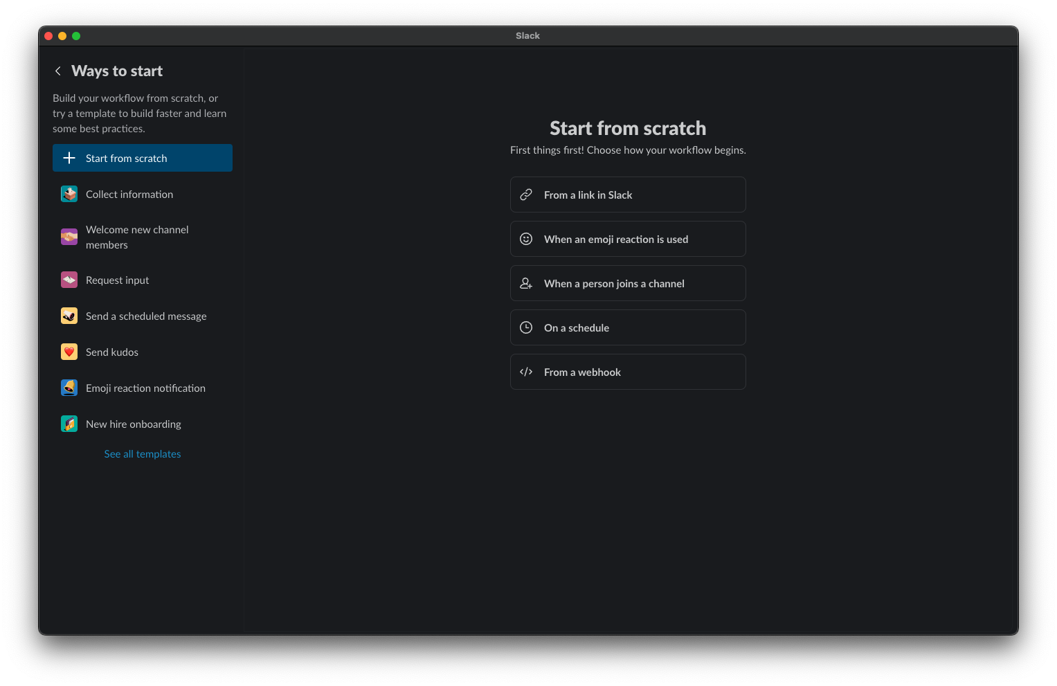 In Slack, open the Workflow page by searching for Workflows in the search bar and click the Create a Workflow button. Then, choose the From a webhook option: