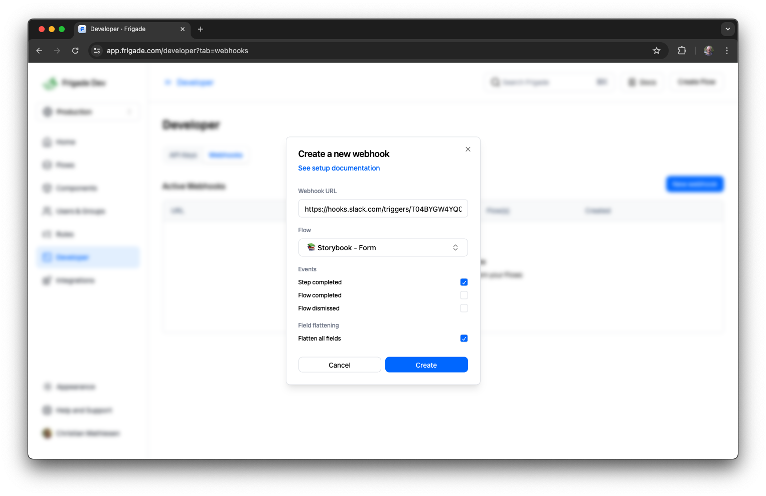 - Create a new webhook in Frigade and paste the Slack Webhook URL.