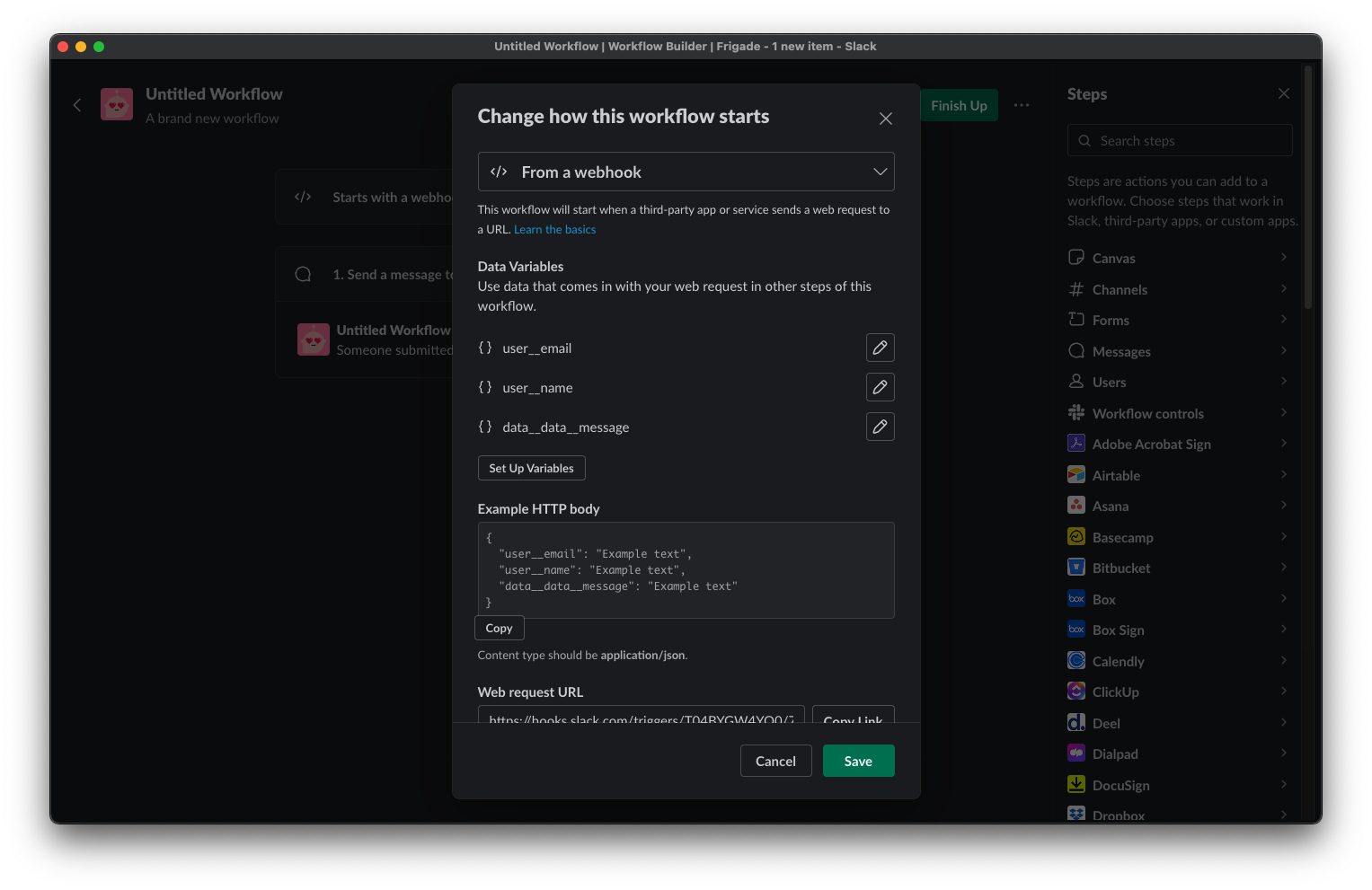 In the Slack Workflow, click the Starts with a webhook card at the top and add the variables you’d like to send in your Slack message as seen below: