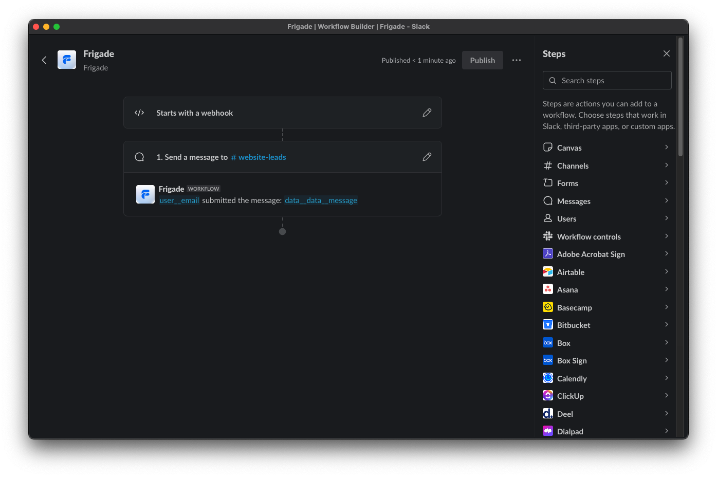 Finally, hit the Publish button in the top right corner to make your Slack Workflow live.