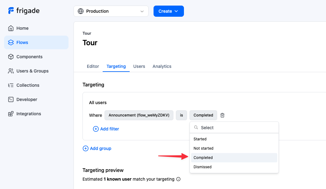 You may want to launch another Flow when a user clicks on the primary button of a different Flow. For example, you can launch a tour Flow when a user clicks on the primary button of an announcement. You can achieve this my modifying the Targeting of the tour Flow directly in the Frigade dashboard, locating the given announcement under Flows and selecting Completed (typically initiated by the primary button) or Dismissed (if the user clicks the X button in the announcement).