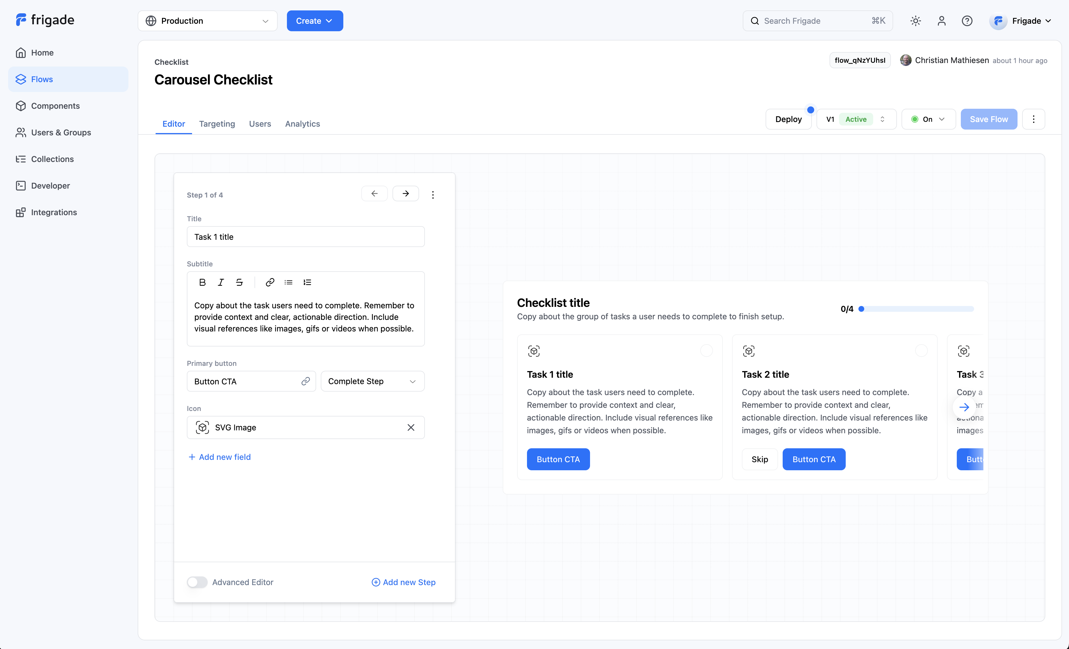 When using a Frigade pre-built UI, you can simply preview the Flow from the Editor tab of the Flow detail page. To see your Flow in your product, you can view your Flow in your staging or production environment.If you’d like, you can use targeting to only show it to teammates while building, and you can reset users in the Users tab to go through the Flow multiple times.